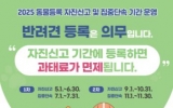 김제 박인석 기자2025. 08.29[뉴스채널]김제시는 성숙한 반려동물 문화 정착 및 유실‧유기동물 발생 예방을 위해 오는 9월 1일부터 10월 31일까지 2차‘동물등록 자진신고 기간’을 운영한다고 밝혔다. 동물등록제 인지도가 매년 높아지고 있지만 여전히 제도를 알지 못해 반려동물을 등록하지 않은 사례가 있어 자발적 등록을 유도하기 위해 상반기에 이어 자진 신고 기간을 추가 운영한다. 동물보호법에 따르면 등록 대상은 주택 또는 준주택, 그 외 장소에서 반려 목적으로 기르는 2개월령 이상의 개는 동물등록 대행기관(동물병원·동물판매업소 등)을 통해 반드시 등록해야 한...