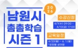 남원 박인석 기자2026. 03.18[AI 호남뉴스]남원시는 시민의 다양한 학습 수요를 반영한 ‘2026년 남원시 수시특강 촘촘학습 시즌1’을 오는 4월 20일부터 5월 27일까지 운영한다. 수강신청은 4월 1일 오전 9시부터 4월 10일 오후 5시까지 남원시 통합예약·신청시스템을 통해 선착순으로 진행된다. 촘촘학습 시즌1은 시민의 삶 가까이에서 배움을 지원하는 ‘일상채움 평생교육’과 생각의 폭을 넓히는 ‘사유반짝 평생교육’으로 나누어 운영된다. 생활밀착형 실용 강좌와 인문·사유형 강좌를 균형 있게 구성해 시민들이 취향과 관심에 따라 폭넓게 참여할 수 있도록...