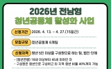 영광 박인석 기자2026. 04.13[AI 호남뉴스] 영광군은 청년들의 지역 활동 기반을 마련하고 지역사회 활동 주체로 성장할 수 있도록 지원하기 위해 오는 4월 27일까지 ‘2026년 전남형 청년공동체 활성화 사업’ 참여팀을 모집한다고 밝혔다. 이번 사업은 총 6개 팀을 선정해 팀별로 600만 원의 활동비를 지원하며, 발대식과 성과공유회, 네트워크 행사 등 다양한 교류 프로그램도 함께 운영될 예정이다. 신청 대상은 청년 5인 이상으로 구성된 팀·법인·단체이며, 모집 분야는 ▲지역연계 ▲일자리·창업 ▲문화·예술 ▲봉사활동 등 4개 분야다. 지역사회에 새로운 활...