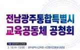 신안 박인석 기자2026. 03.10[AI 호남뉴스]광주시교육청 ‘광주전남교육행정통합실무단’과 전남도교육청 ‘전남광주교육행정통합추진단’이 교육통합과 관련해 시도민의 이해를 돕기 위해 ‘전남광주통합특별시 교육공동체 공청회’를 개최한다. 이번 공청회는 광주 실무준비단과 전남 통합추진단이 지난 9일 실무 협의회를 통해 광주전남 통합교육체계 구축을 위한 교육공동체 의견수렴의 필요성에 대해 공감대를 형성하면서 마련했다. 공청회는 18일 오후 3시 광주시민협치진흥원 대강당과 23일 오후 3시 전남 순천만생태문화교육원 등에서 두 차례에 걸쳐 진행된다. 주요 내용은 ▲교육행정...