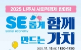 익산 박인석 기자2025. 11.11[뉴스채널]전라남도 나주시가 사회적경제기업의 지속 가능한 가치와 시민 참여를 함께 담은 축제의 장을 개최한다. 나주시는 오는 15일 빛가람동 호수공원 중앙무대에서 ‘2025 사회적경제 한마당’을 연다고 11일 밝혔다. 시는 이번 행사를 통해 사회적경제의 성과를 시민과 공유하고 기업 간 협력과 판로 확대를 지원함으로써 지역경제 활성화에 새로운 활력을 불어넣을 계획이다. 이번 행사는 사회적경제기업의 홍보와 지속 가능한 가치 확산을 목표로 마련됐으며 나주시 사회적경제기업 20개소가 참여해 시민과 함께하는 다양한 프로그램을 선보일 계...