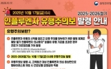 남원 박인석 기자2025. 10.28[뉴스채널]남원시는 질병관리청이 지난 17일 0시부로 전국에 ‘2025-2026절기 인플루엔자 유행주의보’가 발령함에 따라 인플루엔자 예방접종 및 호흡기 감염병 예방수칙 준수를 당부했다. 질병관리청에서 운영 중인 의원급 의료기관 인플루엔자 의사환자 표본감시 결과, 올해 40주차(9.28.~10.4.) 인플루엔자 의사환자 분율이 1,000명당 12.1명으로, 25~26절기 인플루엔자 유행기준인 9.1명을 초과하여 작년보다 약 두 달 가량 빠른 17일에 인플루엔자 유행주의보를 발령했다. 인플루엔자 유행주의보 발령되면, 고위험군 대상...