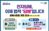 해남 박인석 기자2026. 04.09[AI 호남뉴스]목포시는 '담배사업법' 개정 시행에 따라 액상형 전자담배가 공식적인 규제 대상에 포함됐음을 알리고 시민들의 주의를 당부했다. 개정된 '담배사업법'은 기존 ‘연초의 잎을 원료로 한 제품’으로 한정됐던 담배의 범위를 ‘연초 또는 니코틴을 원료로 제조한 제품’까지 확대했다. 이에 따라 액상형 전자담배도 일반 담배와 동일하게 금연구역 규제를 받게 된다. 오는 4월 24일부터 금연구역에서는 일반 궐련뿐만 아니라 궐련형·액상형 전자담배 등 모든 담배 제품의 사용이 금지된다. 금연구역에서 흡연이 적발될 경우 '국민건강증...